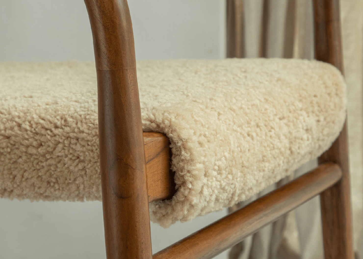 Find the Crescent Shearling Dining Chair at ZM Home, featuring premium Australian shearling upholstery on a sturdy steel frame, with ergonomically curved backrest and space-saving stackable design that masterfully balances comfort and functionality.