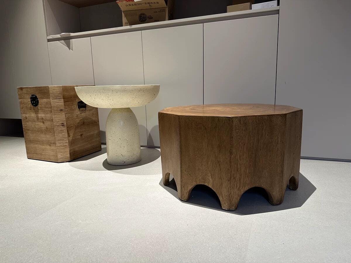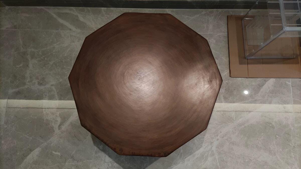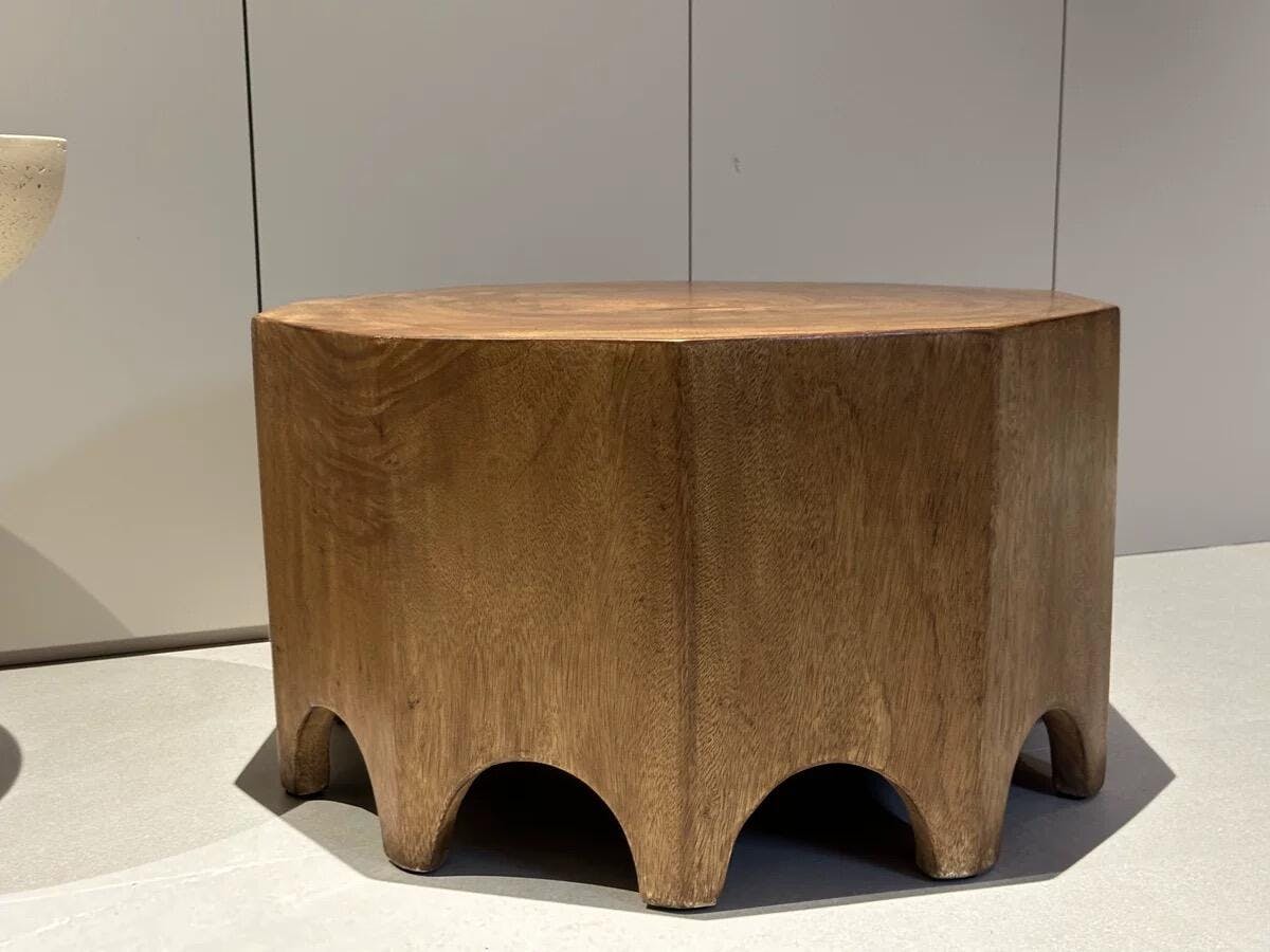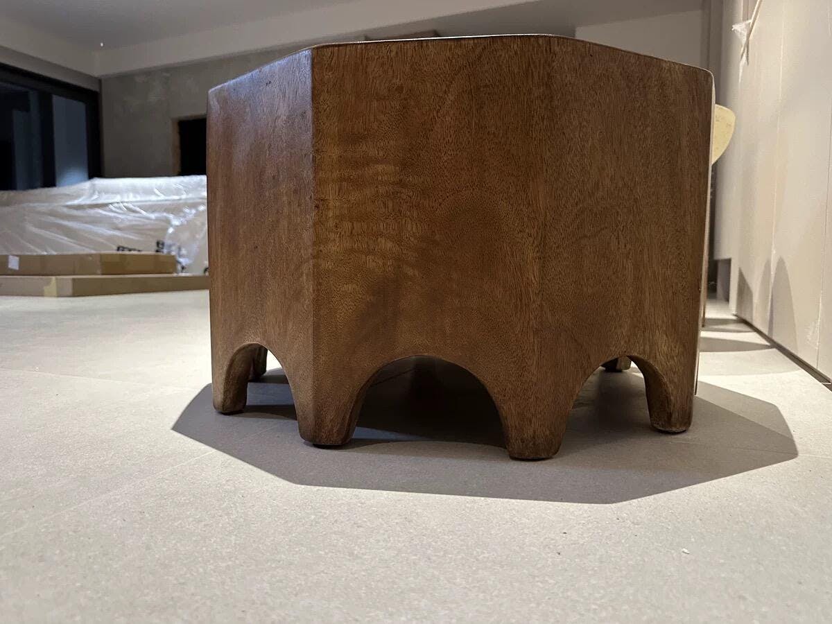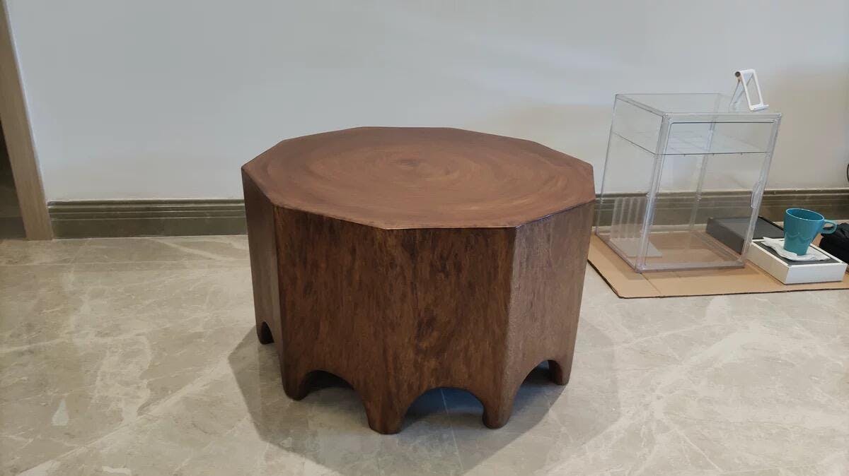 The Decagon Side Table, made from solid rainwood, features a unique ten-sided design with hand-polished finishes. Available in wood color and carbonized black, this versatile table is perfect for any interior style.