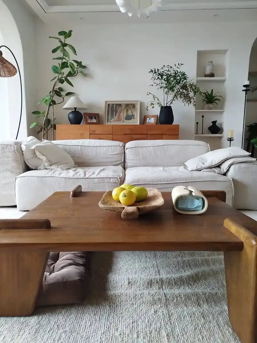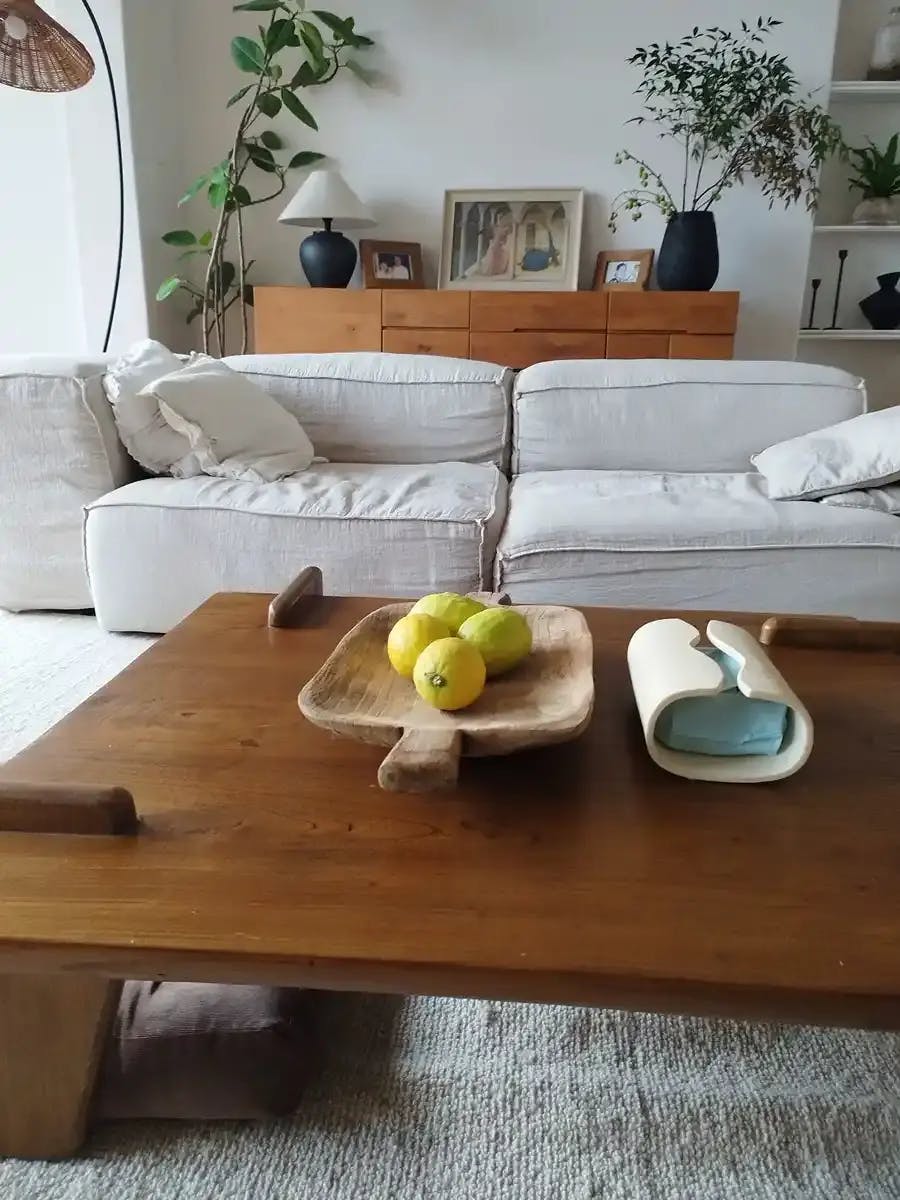 The Deck Coffee Table features a rectangular wood top on four thick legs. The uneven surface elevates the natural look of this table, adding to its worldly appeal.