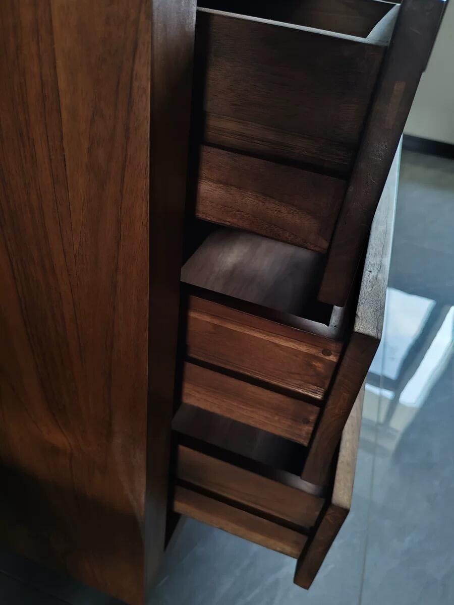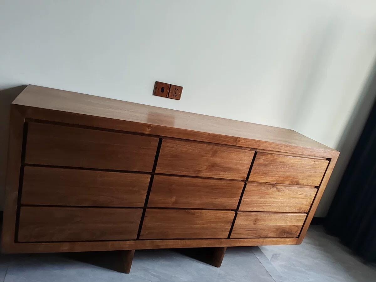 The Palette Teak Sideboard at ZM Home blends minimalist sophistication with functional design. Its streamlined silhouette and thoughtfully arranged drawers offer generous storage, while warm teak wood accents elevate modern interiors with organic elegance.