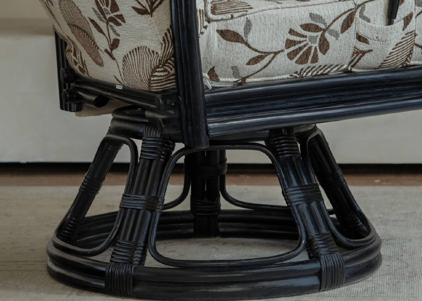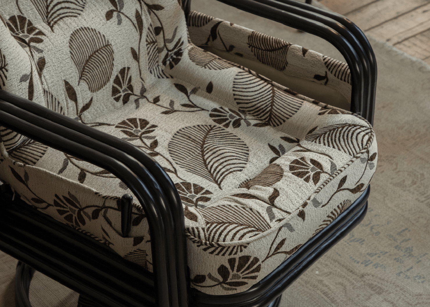 Willow Rattan Chair with floral cushions, black rattan frame and modern design, perfect for your living room.